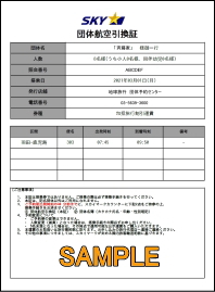 スカイマーク団体航空券でのチェックインは、事前にお送りさせていただきましたE-チケット(グループ名・人数・便情報のみ入っているもの)をA4サイズでプリントアウトして、カタカナフルネーム・年齢・性別を記入いただいたネームリストと一緒に有人のチェックインカウンターにお持ちいただき手続きしていただきます。